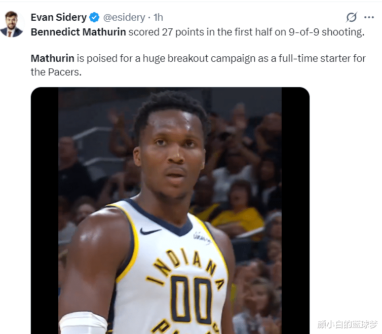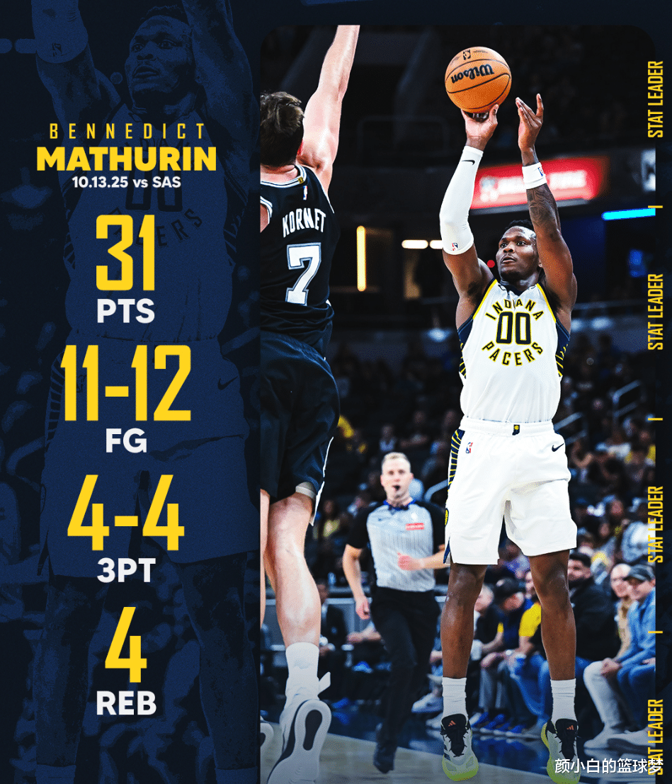 On October 14, in the NBA preseason, the Pacers defeated the Spurs 108-124. In this game, the Spurs' Castle and Vassell returned. The Pacers also used their regular starters for the new season. The two teams were relatively close in the first three quarters. In the final quarter, the Pacers were completely inferior to the Spurs in the third lineup of the two teams. Marcelin, who started at No. 2 position, scored 14 points and 1 rebound in the first 9 minutes of the game, scoring 4 of 4, 3 of 3 three-pointers, and 3 of 3 free throws. In the second quarter, he made 5 of 5 + 1 of 1 three-pointer in 8 minutes. In the first 18 minutes, he made 9 of 9, 4 of 4 three-pointers, 5 of 5 free throws, and scored 27 points, 1 rebound, 1 assist, and 1 steal. His shooting percentage was 100%, and his true shooting percentage was as high as 120.5%. He only played less than 5 minutes in the third quarter, and he missed his first shot in this quarter (2 of 3). In 23 minutes of the game, he made 11 of 12, 4 of 4 three-pointers, and 5 of 5 free throws. He scored 31 points, 4 rebounds, 1 assist, and 1 steal. His shooting percentage was 91.7%, his three-point shooting percentage was 100%, his free throw percentage was 100%, and his true shooting percentage was 109.2%. Everyone knows how much discussion Marcelin's game caused across the United States when you open The Pacers also posted Marcelin's game data and praised him. You must know that in the previous two preseason games, he scored 8 points in 14 minutes and 16 points in 16 minutes, but he has started all of them. He only started 49 games last season (a total of 72 regular season games). He will lock the starting seat in the new season because Nembhard will play the No. 1 position. NBA reporter Evan Stirry said that Marcelin's starting position is the key to his outbreak, and he can be expected to perform brilliantly in the 25-26 season. (Last season Marcelin averaged 16.1+5.3+1.9+0.7+0.3 per game)