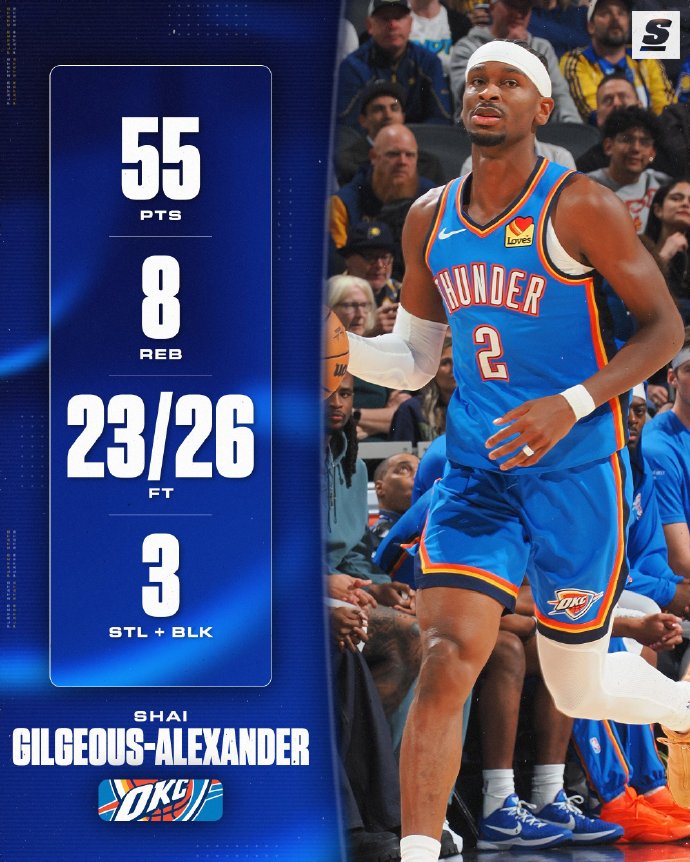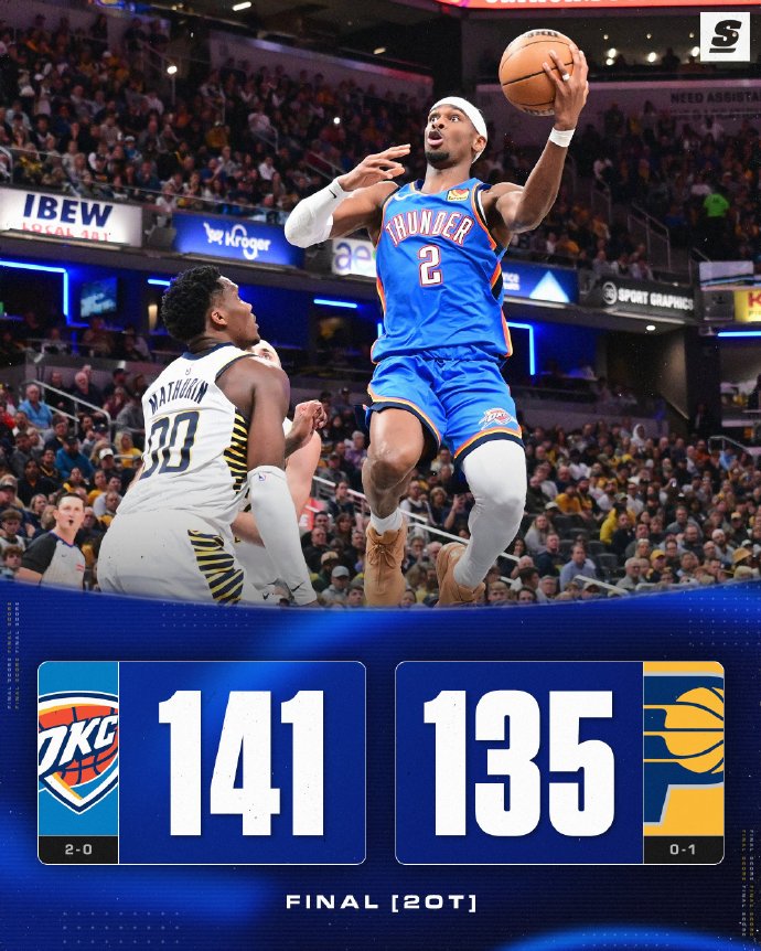 After narrowly defeating the Rockets by one point in double overtime at home in the opening game, the Thunder challenged last season's finals opponent on the road today. In the end, it went to double overtime and defeated the Pacers 141-135, achieving two consecutive victories. It is worth mentioning that the Thunder has also become the seventh team in NBA history to score overtime in the first two games of the season. The last one was the Rockets in 2001. Moreover, the Thunder reached double overtime in two consecutive games at the beginning of the season, becoming the first team in history to do so. The reason why the Thunder's first two games went to double overtime is because the opponents are very good. The Rockets were second in the Western Conference last season, and the Pacers even reached the Finals last season. On the other hand, the Thunder's lineup is also incomplete, and Jaylen Williams is still recovering from injury. Although this game is a replay of last season's finals, both teams have some players absent today. On the Pacers' side, Haliburton and McConnell did not play, while on the Thunder's side, Jaylen Williams, Caruso, Wallace, and Isaiah Joe all sat on the sidelines. Alexander continued to show his power, showing the dominance of MVP+FMVP. He played 45 minutes and made 15 of 31 shots, including 2 of 7 three-pointers and 23 of 26 free throws. He scored 55 points, 8 rebounds, 5 assists, 2 steals and 1 shot, with a plus-minus value of +9. Alexander thus became the first man to score 50 points this season. This was also the fifth time in his career that he had 50+ points. The 55 points also set a career high. In addition, the number of 26 free throws also hit a career high. Holmgren, who scored 28 points in the last game, performed quite well today and had a poor touch. He played 39 minutes and made 4 of 12 shots, 0 of 6 three-pointers, and 7 of 8 free throws. He scored 15 points, 12 rebounds, 2 assists, and 2 steals. Ajay Mitchell became a surprise player. He played 38 minutes off the bench and made 9 of 19, 0 of 3 three-pointers, and 8 of 8 free throws. He scored a career-high 26 points plus 3 rebounds and 4 assists. His previous high score was only 17 points, and the plus-minus value was +12, the highest in the game. Wiggins was also very impressive. He entered the starting lineup and played 36 minutes. He made 7 of 14 shots, 5 of 9 three-pointers, and 4 of 4 free throws. He scored 23 points and 9 rebounds, with a plus-minus value of +8. Hartenstein played steadily, playing 37 minutes, making 2 of 4 shots, 1 of 3 free throws, 5 points, 14 rebounds and 2 assists, the most rebounds on the team. Dortmund's performance was average, playing 43 minutes, making 2 of 6 shots, 1 of 4 three-pointers, 2 of 2 free throws, 7 points, 8 rebounds, 2 assists, 1 steal, and 3 turnovers.