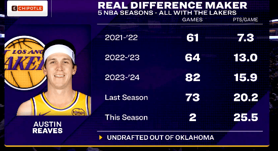 Hupu News on October 27th NBA regular season, the Lakers’ away game against the Kings is in progress. In the second quarter of the game, the broadcast screen showed a set of data, which showed Reeves’ scoring average in each season after entering the NBA. The details are as follows: In the 2021~22 season, he averaged 7.3 points per game in 61 games In the 2022~23 season 13.0 points per game in 64 games 15.9 points per game in 82 games in the 2023~24 season 20.2 points per game in 73 games in the 2024~25 season 25.5 points per game so far in the 2025~26 season