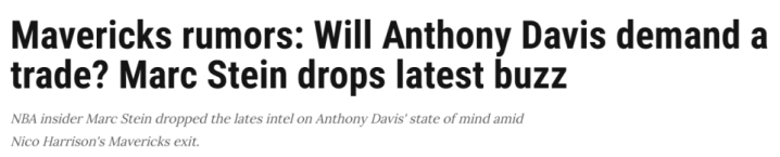 On November 13, according to the famous reporter Stein, the Mavericks are expected to communicate with Anthony Davis’ team within the next two months to decide whether to advance a transaction involving him within this season. Stein wrote: "Harrison has always admired Davis very much and had planned to build the team's core lineup around him. Now Harrison has been suddenly fired, but there is currently no sign that Davis will insist on asking to leave the team due to Harrison's departure." "The Mavericks will communicate with Davis' team in the next two months to decide. Determine whether to proceed with a deal involving him during this season. Davis' agent Rich Paul and Mavericks owner Dumont have established a regular communication relationship since the team won the playoffs in Sacramento. Therefore, the parties are expected to coordinate to a certain extent to promote subsequent matters. " If Davis is traded, the Mavericks will undoubtedly obtain some future assets. Because the 2026 draft will be the last time the team has its own first-round pick before 2031. However, this deal will also be an unacceptable result for the team. You know, Harrison's core purpose in promoting Doncic's trade was to team up Davis and Irving to compete for the championship trophy. At present, the exact value of Davis' transaction is still uncertain. Especially recently, his injury risks have become highlighted again, which undoubtedly makes his trade value even more confusing. So far this season, Davis has only played in 5 games due to injury, averaging 20.8 points, 10.2 rebounds and 2.2 assists per game, shooting 52% from the field and 27.3% from the three-point range.