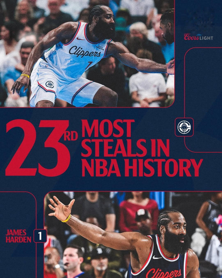 Clippers ins report. James Harden sets another milestone on the NBA's all-time steals list! With his 1,725th career steal, he officially surpassed the legendary star Magic Johnson and climbed to 16th on the all-time steals list. The seven-time All-Star guard is currently averaging 1.5 steals per game and continues to write his own legendary chapter. Stealin’anotherspotinthehistorybooksWithhis1,725thcareersteal,JamesHardensurpassedMagicJohnsononthe@nba’sall-timestealslist!