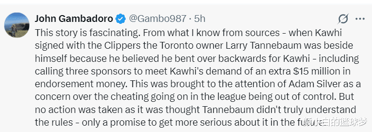 On September 4, ESPN has published a report on the incident of Kawhi Leonard and the Los Angeles Clippers allegedly signing a yin-yang contract. TA reporter Pablo Torre revealed that Xiao Ka had a false endorsement contract with a suspected fraud carbon neutrality (tree planting) company. The endorsement fee for this contract is as high as 28 million, and the investor of the company is Clippers boss Steve Ballmer. ESPN famous reporter Shams has revealed that NBA spokesman Mike Bass has said he has learned about the situation about the Los Angeles Clippers and the league has begun an investigation. According to Ary's report, the alliance office is "fully aware of" the Leonard Yin-Yang contract incident, and the alliance has begun to actively investigate. Xiaoka and the Clippers have always been on hot searches across the United States because the impact of this incident was too bad. The Clippers official has also made a statement that the TA reporter's revelation is false, but this incident is still fermenting. revelation reporter Pablo Torre said that he had asked Ballmer about the topic of Yin-Yang contract early in the morning. At that time, Ballmer denied it directly because at that time Ballmer had no idea that we had undergone a detailed investigation. We had more than 3,000 pages of information and the testimony of 7 witnesses. Raps Ronaldo reporter John Gambadoro: In 2019, Shakawhi Leonard asked Toronto Raptors boss Larry Tannbaum to earn an additional $15 million in endorsement revenue for him before deciding to sign the Clippers. Raptors boss Tannbaum also personally contacted three sponsors to meet Kawhi's additional 15 million endorsement fees, which attracted Xiao Hua's attention. He was once worried, but the league did not take any action. Lakers reporter Anthony Laurien: I remember reporting on the Lakers' pursuit of Kawhi that summer. We all remember, haha. The Lakers insist to this day that they would take him down. Then, something happened. (It implies that the Clippers signed Leonard because of the Yin-Yang contract) In fact, there are many regulations in the TA reporter's revelation that have become indirect evidence: 1. If Leonard leaves the Clippers or retires from the NBA, then this agreement will be invalidated, and this agreement is equivalent to Xiaoka's salary in the Clippers; 2. As long as Leonard keeps playing in the Clippers, he can always receive his salary from this agreement. There are also many American media sarcastic about this matter. Xiao Ka has not spoken yet, and it should be determined by the alliance's investigation results. It is reported that Xiaoka has been investigated twice since joining the Clippers in 2019, but the results are both innocent.