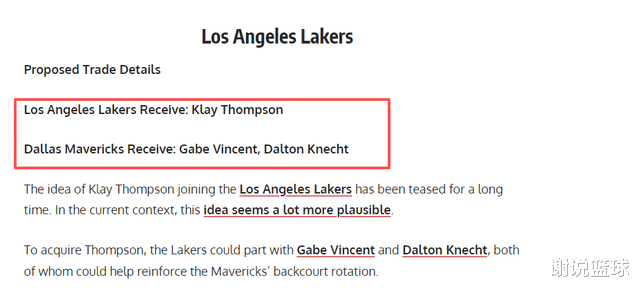 As a former Warriors hero, Klay Thompson has gone through ups and downs in the past two years. Originally, he chose to join the Mavericks because of Doncic and Irving. Unexpectedly, Doncic was sent to the Lakers last season, and Klay Thompson was relieved. He indulged in gentleness during the offseason, and now his performance is ups and downs. Because the current attitude of the Mavericks management is to rebuild around Flagg, even "big eyebrow brother" Anthony Davis is likely to be sent away, so Klay Thompson is unsurprisingly once again involved in rumors of leaving the team. Of course, a skinny camel is still bigger than a horse, and Klay Thompson is not short of buyers. The media FW encouraged the Lakers to trade him, and the two substitutes Vincent and Knecht will become bargaining chips. In fact, as long as Klay Thompson is given a comfortable shooting space, he will still play great value. The key is that the Mavericks lineup is really abnormal, the team lacks an offensive commander, and there are even few reliable shooters. Therefore, when Klay Thompson is on the court, he is often the only reliable shooting spot. It is natural for him to be unable to provide good performance when faced with tight defense. And Klay Thompson has entered the twilight years of his career. Seeing that the team has no hope of competing for the championship, he will naturally slack off. After all, the Mavericks have no desire to win at all, so the veteran will naturally have reservations. But if Klay Thompson goes to the Lakers, the situation will change drastically. The creativity of Doncic and Reeves has been demonstrated several times this season, which will create a lot of open opportunities for Klay Thompson. So Klay Thompson can catch and shoot three-pointers from the outside. Now Klay Thompson is also at the top level in the league. Not to mention that James is also coming back and is looking very good. The Lakers have three core ball-handlers. For elite shooters like Klay Thompson, it is a perfect offensive environment. The Lakers can also expect him to regain his feeling. The key point is that from the perspective of the trade plan, the Lakers did not pay a big price. Vincent recovered last season and was still a competent substitute guard. However, he suffered from injuries this season. In addition, Smart is in great form. Therefore, with the lineup intact, there is no room for him in the Lakers rotation. Kneckert, on the other hand, started high and went low. He became a surprise player several times in his rookie season, but now it seems that it is just a flash in the pan. Kneckert's highlights on the field are not even as many as Bronny, and he is probably not in the long-term plan.