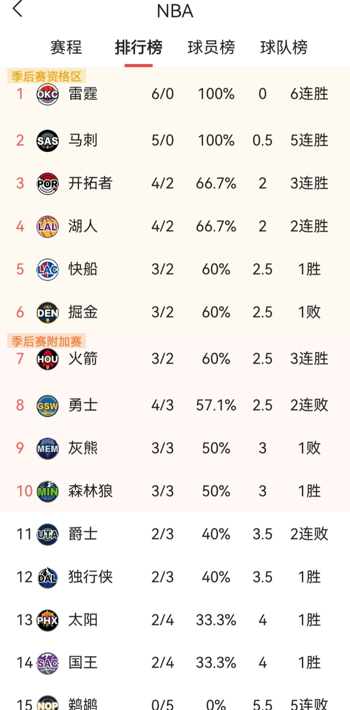 After the NBA regular season has played 6 focus games, the Western Conference rankings will directly undergo a major reshuffle. What seemed to be a relatively clear pattern at first was completely disrupted. The Rockets won three consecutive victories with a big victory over the Celtics and rushed directly to seventh place in the Western Conference. The Warriors lost two consecutive losses to the Pacers and dropped to eighth place, which completely exposed their true state. The most unexpected thing is the Thunder and Spurs. One is ranked first with 6 wins and 0 losses, and the other is ranked second with 5 wins and 0 losses. I am afraid that few people can guess the performance of these two teams before the game. First, the top four in the Western Conference completely "changed", and the Thunder Spurs became the biggest surprise. Let’s first look at the rankings of the top four in the Western Conference. Now it’s really surprising. The Thunder ranked first with an unbeaten record of 6 wins and 0 losses. This result is too valuable - you must know that their core Holmgren has missed many games due to injury, and Jaylen Williams has not played a game, relying on the remaining players to fight for six consecutive victories. If it were another team, they would have collapsed without two cores. However, not only did the Thunder not collapse, they were able to win all kinds of tough battles, which shows how terrifying their team depth is. The current Thunder are fully qualified to defend the championship. The Spurs are ranked second, and their record of 5 wins and 0 losses is also impressive. Although some people say that the Spurs took advantage of the schedule and their early opponents were not strong, everyone who has watched the game knows that their progress this season is real. In the past, the Spurs always stumbled on the offensive end and easily missed people on defense. But things are different now. They can cooperate smoothly on the offensive end and can defend the penalty area on the defensive end. The tacit understanding between the players has improved visibly. They are no longer the soft persimmons who were bullied in the past. Such a Spurs are definitely worthy of being ranked second in the Western Conference. The Trail Blazers are ranked third with 4 wins and 2 losses, and are continuing their three-game winning streak. Their performance this season is also very stable, and the team's chemical reaction is getting better and better. Whether they are the main players or substitutes, they can find their own rhythm on the court. They have sufficient firepower on the offensive end and sufficient resilience on the defensive end. They can stabilize the top three positions, which is achieved entirely through hard power. It is worth mentioning that Chinese player Yang Hansen was transferred to the Development League. For him who wants to gain a foothold in the NBA, the time left to prove himself is really getting less and less. If he cannot perform well in the Development League, it may be difficult to return to the NBA. The Lakers are ranked fourth with 4 wins and 2 losses, and their performance during this period can be considered reasonable. James did not play, and Doncic only played a few games. It was all up to Rius to carry the team forward. His explosion gave Lakers fans hope. Before, they were worried that no one in the Lakers could stand up and score. Now with Rivers' violent output, at least there is no need to worry too much on the offensive end. However, the Lakers' current problem is also obvious. They are over-reliant on Rivers. If his condition declines, the team will easily get into trouble, and they will have to find ways to get other players to step up. In addition, the Clippers and Nuggets ranked fifth and sixth respectively with 3 wins and 2 losses. As the Western Conference powerhouses in the past few years, their current performance can only be considered satisfactory, and they have not yet fully found their best form. Second, the Rockets won three consecutive games and rushed to seventh place in the Western Conference, with Durant becoming the biggest contributor. The Rockets are definitely one of the most eye-catching teams on November 2. They defeated the Celtics 128-101. Not only did they win three consecutive victories, but their record also reached 3 wins and 2 losses. They rushed directly from the previous mid-range position to seventh in the Western Conference. Who would not say "surprise" after seeing such an improvement speed. The Rockets played too smoothly in this game, firmly controlling the rhythm from beginning to end, and did not give the Celtics any chance to make a comeback. At the beginning of the first quarter, the Rockets were on full fire, scoring both inside and outside, and quickly established their lead; in the following quarters, the Rockets played smoother and smoother, and the point difference widened. In the end, they even won by 27 points. Durant only played 30 minutes and clocked out easily, which is enough to show the disparity of the game. The performance of Shen Jing and Durant contributed greatly to winning this game. Shen Jing played 31 minutes, making 5 of 13 shots, 1 of 3 three-pointers, and 5 of 7 free throws. He scored 16 points, 10 rebounds, 9 assists, 1 steal, and 2 blocks. His plus-minus value was as high as +24, and he almost got a triple-double. His role on the court is so crucial. Not only can he score in the paint and grab rebounds, but he can also pass the ball to connect the team and organize the Rockets' offense in an orderly manner. Now Shen Jing is more and more like "making an appointment with the teacher". What is more worth mentioning is Shen Jing's performance in the first five games of the season. He averaged 22.2 points, 8.4 rebounds, and 7.6 assists per game, with a true shooting percentage of 60.3%. At the age of 23 years and 100 days, he became the youngest player in NBA history to average at least 2