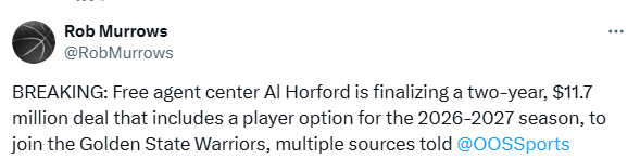 On September 5, the Warriors' first signing this summer finally came. According to famous reporters, the Warriors and champion center Horford reached a two-year agreement of $11.7 million, of which the second year is the player option; at the age of 39, Horford left the Celtics and joined the Warriors to assist Curry and Butler in the championship. Due to Tatum's serious injury from a ruptured Achilles tendon, the Celtics quickly demolished the team and rebuilt. This summer, the Celtics have traded two major champions of Holiday and Porzingis, and even heard quotations about Jaylen Brown and White; now 39-year-old Horford has also confirmed to leave the Celtics. After the end of the 2024-25 season, the contract between 39-year-old Horford and the Celtics expired. Horford, who has returned to his free self, has aroused the interest of teams such as the Lakers and the Warriors; it is reported that the Lakers gave Horford a two-year special case of $5 million, while the Warriors have been waiting for Horford to make a decision. In addition to considering the Lakers and the Warriors, Horford also considers the retirement option. The outside world generally expects Horford to join the Warriors; after a period of consideration, Horford finally decided to join the Warriors and continue his career. He will start his 19th season of his career with the Warriors; Horford is a space-type center, 2.06 meters tall and weighs 108 kilograms, with a body shape and able to shoot three-pointers, becoming an important puzzle for a strong team to win the championship. Horford was a 2007 Tenhua, starting his career from the Hawks, leaving Atlanta in 2016 to end his nine-year Hawks career, and signed a four-year, $110 million contract with the Celtics; in 2019, Horford rejected the $30.12 million player option, left Boston and signed a four-year, $109 million new contract with the 76ers. Horford was traded to the Thunder after only one season with the 76ers. In 2021, Horford returned to the Celtics. Until the 2023-24 season, Horford helped the Celtics win the 18th championship in team history, and he finally realized his dream of winning the championship. So far in his career, Horford has played in 1,138 regular season games, averaging 31.6 minutes per game, able to score 12.9 points, 7.9 rebounds, 3.2 assists and 1.1 blocks, with a shooting percentage of 50.9% and a three-point shooting percentage of 37.7%. He has played in 197 playoff games, and averaged 33.minutes per game, and was able to score 11.9 points, 7.9 rebounds, 3.2 assists and 1.2 blocks. Horford has been selected into the All-Star lineup 5 times, one time selected into the Best Team, one time selected into the Best Team for the Best Team for the Best Team for the Best Team for the Best Team for the Best Team for the Best Team for the Best Team for the Best Team for the Best Team for the Best Team for the Best Team for the Best Team for the Best Team for the Best Team for the Best Team for the Best Team for the Best Team for the Best Team for the Best Team for the Best Team for the Best Team for the