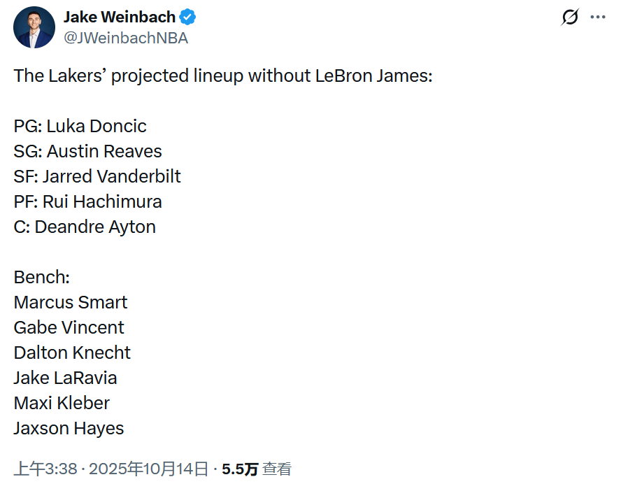 On October 15th, there is still one week left before the start of the new NBA regular season. Due to James' injury, the Lakers' lineup changed at the beginning of the season. The famous reporter Jake Weinbach gave his prediction, but coach Redick said that the final five have not yet been determined. Based on the current situation of the Lakers, as well as recent training, preseason games, and injuries, the famous reporter Jake Weinbach gave his own analysis and predicted the Lakers' starting lineup for the new season without James. Jake Weinbach's predicted starting lineup is: Doncic, Reeves, Vanderbilt, Rui Hachimura, Ayton; the substitute lineup is: Smart, Vincent, Knecter, Laravia, Kleber, Hayes. In an interview, coach Redick did not give a clear starting five. He said: "You always want to put the five best players on the court as much as possible. At the same time, you also want each lineup to be balanced. When we proceed When analyzing substitution indicators, we will consider, who will defend? Who will create opportunities? Do we have enough shooting ability? Therefore, you will take these factors into consideration when arranging each lineup, including the starting lineup." Later, Redick said: "We are still working on it. The starting issue, obviously, James' absence at the beginning of the season complicated things a little bit. So we have another week to figure this out and I think eventually we'll find out. When we formulate our rotation strategy, we will focus on three core questions: Who will take on the defensive task? Who will attack? Do we have enough firepower from outside? " What is certain is that Doncic, Reeves, Ayton, and Rui Hachimura will almost occupy the four starting positions, and the only suspense is only in the last position. According to the schedule, the Lakers will play against the Warriors in the opening game of the new season. What kind of starting lineup do you think the Lakers will field? Welcome to give your opinions in the comment area.