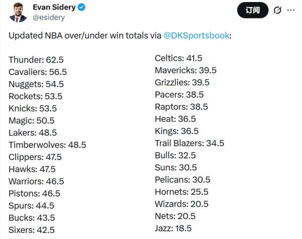 There are only 13 days left before the start of the new NBA regular season. Earlier today, the well-known media DKSportsbook updated the prediction of the number of wins for the 30 teams in the new season. The Thunder became the only team with 60+ wins, the Rockets were predicted to win 53.5 games, and the Lakers ranked 7th. DKSportsbook predicts the number of wins for the 30 teams as follows: Thunder 62.5 wins, Cavaliers 56.5 wins, Nuggets 54.5 wins, Rockets 53.5 wins, Knicks Sri Lanka 53.5 wins; Magic 50.5 wins, Lakers 48.5 wins, Timberwolves 48.5 wins, Clippers 47.5 wins, Hawks 47.5 wins; Warriors 46.5 wins, Pistons 46.5 wins, Spurs 44. 5 wins, Bucks 43.5 wins, 76ers 42.5 wins; Celtics 41.5 wins, Mavericks 39.5 wins, Grizzlies 39.5 wins, Pacers 38.5 wins, Raptors 38.5 wins; Heat 36. 5 wins, Kings 36.5 wins, Trail Blazers 34.5 wins, Bulls 32.5 wins, Suns 30.5 wins; Pelicans 30.5 wins, Hornets 25.5 wins, Wizards 20.5 wins, Nets 20.5 wins, Jazz 18.5 wins. As the championship team last season, the Thunder have become the most promising team. The team renewed the contracts of the team's three big players this summer, and the team currently does not have any injuries. On this basis, there does not seem to be much suspense for them to once again win the league's first record. The Cavaliers were the team with the best regular season record in the Eastern Conference last season. They also upgraded their lineup this summer and are therefore expected to win the most games in the Eastern Conference. The Rockets are the biggest winner this summer. They acquired Durant through a big deal, and then signed Finney-Smith and others. However, VanVleet's season reimbursement was a huge blow to the team. The Lakers signed Ayton, Smart and others this summer, and completed a contract extension with Doncic. James + Doncic will usher in their first complete season with the Lakers. The Warriors have been deeply involved in Kuminga's contract issues this summer, but fortunately they have successfully resolved it and have successively signed Horford and others. In addition, among the bottom teams, the Jazz "stand out", becoming the only team predicted to win less than 20 games. What do you think of this prediction?