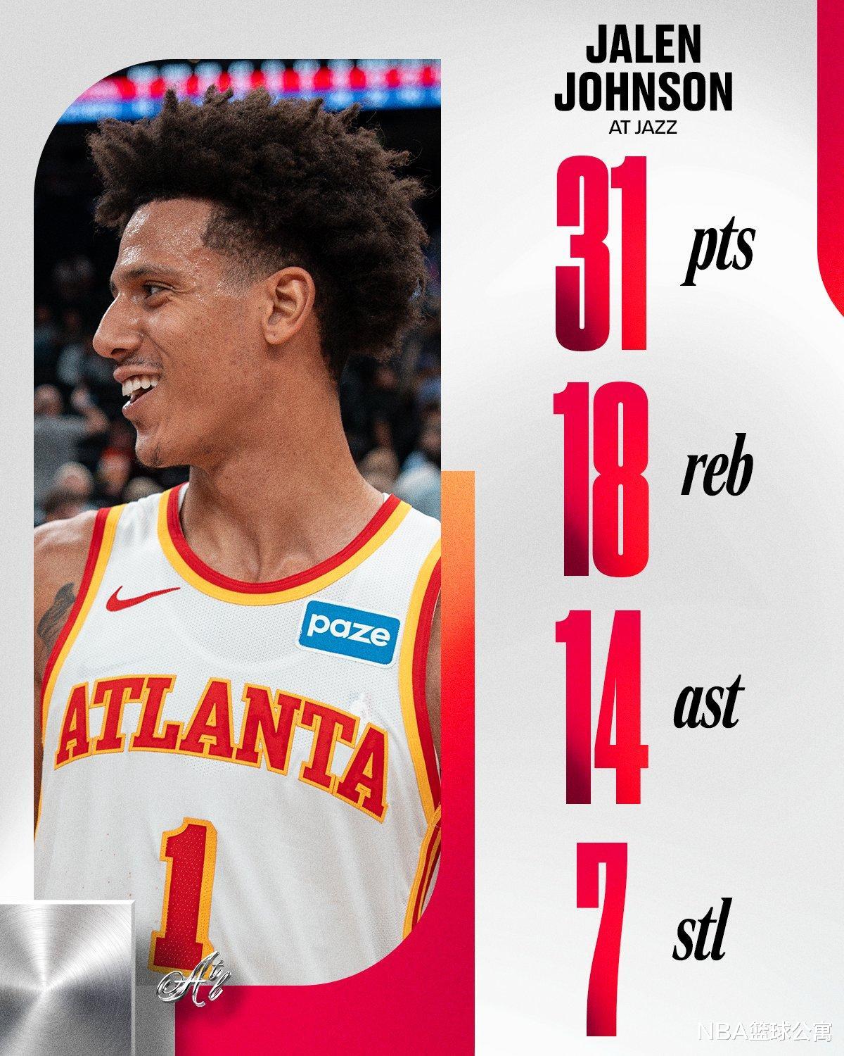NBA regular season Hawks VS Jazz On November 14, the NBA regular season continues. The Hawks went to the road to face the Jazz. In this game, Trae Young and Porzingis were injured. Atlanta's starting five are Jaylen Johnson, Okongwu, Daniels, Walker and Risa Shee. Kyle Lee, Hendricks, and Niang are injured, and Kessler is reimbursed due to injury. Salt Lake City's starting five are Markkanen, Nurkic, Mykhailiuk, Bailey and Keonte George. Although they are playing back-to-back games, the Eagles, who have won three consecutive games, are determined to continue their strong form. The two powerful teams competed fiercely in this campaign, and the trend on the field also changed many times. With a blast of 31+18+14+7 steals, Johnson set the first two miracles in NBA history and set a record! Okongwu is stunning! Full game review At the beginning of the first quarter, the two teams started to fight against each other, but the score difference was not widened. After that, Okongwu and Johnson led the team to fire inside and outside. The Eagles held high the offensive banner and set off a continuous scoring frenzy. Salt Lake City's offense was blocked, and Atlanta took the opportunity to widen the point difference to double digits. After the first quarter, the Jazz trailed 33-42. Jalen Johnson layup In the second quarter, Johnson worked hard on both ends of the offense and defense, and also took care of connecting the team. The Eagles continued to attack on the offensive end and widened the point difference to 18 points. Markkanen led the team to chase points frantically, but the Jazz could not limit their opponents' multiple points. At halftime, the Eagles led 80-67. The situation on the field suddenly changed, and Atlanta fell into a scoring dilemma. Markkanen led the team to continuously set off offensive shock waves, and was able to overtake the score. Johnson teamed up with Okongwu to lead the team to score, and the Eagles stabilized the situation. Before entering the final quarter, the two teams were tied. The Jazz led 36-23 in a single quarter. Markkanen versus Jaylen Johnson In the final decisive battle, Atlanta regained its outside touch. Okongwu hit consecutive three-pointers, and the Jazz worked hard to hold on to the score. The Eagles soldiers became more and more courageous as they fought, and were able to maintain a lead of about 10 points. Salt Lake City was unable to chase points, and the game time gradually ran out. In the end, the Eagles defeated their opponents 132-122 and rejected an 18-point reversal. Two team statistics Jazz, Markkanen made 15 of 25, 12 of 12 three-pointers, 6 from the air, scored 40 points, 7 rebounds and 2 assists, Bailey made 8 of 13, 4 of 7 three-pointers, scored 21 points, 5 rebounds, 3 assists and 2 steals, George scored 7 of 19, scored 19 points, 6 rebounds and 7 assists, Nunn Irkic scored 10 points, 10 rebounds, 8 assists and 5 steals on 4 of 7 shots, Collier had 10 points, 5 rebounds and 7 assists, Sensabaugh had 9 points, 3 rebounds and 2 assists, Filipovsky had 8 points, 9 rebounds, 3 assists and 3 blocks, Love had 3 points, 3 rebounds and 4 assists, Williams had 2 points, and Mykhailiuk had 0 points, 1 rebound and 3 assists on 4 of 4 shots. The Eagles captured the Jazz and achieved 4 consecutive victories. For the Eagles, Krejic made 7 of 9, 6 of 8 three-pointers and scored 20 points, 1 rebound, 3 assists and 3 steals. Walker scored 4 of 11. 16 points, 2 rebounds, 5 assists, 2 steals and 2 blocks, Kennard had 12 points, 2 rebounds, 1 assist and 2 steals, Risashe had 11 points, 3 rebounds and 2 assists on 5 of 7 shots, Gueye had 8 points, 2 rebounds and 1 assist, Daniels had 2 points, 2 rebounds and 3 assists on 1 of 2 shots, and Wallace had 2 rebounds and 5 assists. With a blast of 31+18+14+7 steals, Johnson set the first two miracles in NBA history and broke the record. In this campaign, Eagles forward Jaylen Johnson achieved a strong run. Johnson played 40 minutes, making 10 of 19 shots, 4 of 5 three-pointers, 7 of 11 free throws, and a super triple-double of 31 points, 18 rebounds, 14 assists and 7 steals. Johnson scored the second-highest score on the team with a 53% shooting rate, and he also shot 80% from three-point range. As the rebounding and steal leader in this game, Johnson has a strong presence on the defensive end. In addition, Johnson is also the assist leader in this battle. Jalen Johnson Under the leadership of Johnson, the Hawks achieved internal and external fire, everyone was on hand, and 6 people scored in double figures. Johnson played a perfect performance, and he also set two major miracles in NBA history in this campaign. 1. Johnson scored 20 points, 5 rebounds, 8 assists and 5 steals. He was the first player in NBA history to have at least 20+5+5+5 steals in a half. Second, Johnson scored 31 points, 18 rebounds, 14 assists and 7 steals, becoming the first player in NBA history to achieve this statistic. Jalen Johnson's jump shot In addition, Jaylen Johnson also set a record. Johnson's scores, rebounds, assists, and steals all hit career highs in this game. At the same time, Jaylen Johnson is the first player since Paul in 2009 to score 30+ triple-doubles and also send 7 steals in a game. Data shows that this is Jaylen Johnson's first triple-double this season and the third triple-double in his career. Okongwu is stunning In this campaign, the Eagles' starting center Okongwu performed amazingly. Okongwu played 35 minutes, shooting 11 of 18, 8 of 14 three-pointers, 2 of 2 free throws, scoring 32 points, 11 rebounds, 2 assists, 2 steals and 3 blocks, a huge double-double. Okongwu scored the team's highest score with a 61% shooting rate. He also made a game-high 8 three-pointers with a 57% shooting rate. Okongwu, who grabbed the second most rebounds in the game, was also the block leader in this game. Okongwu exploded on both ends of the offense and defense. He made consecutive long-range shots in the final quarter and becam