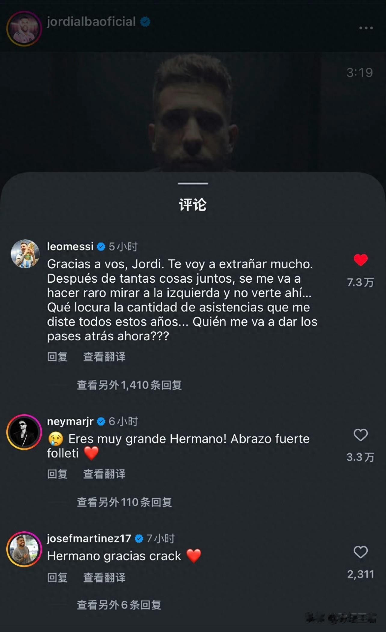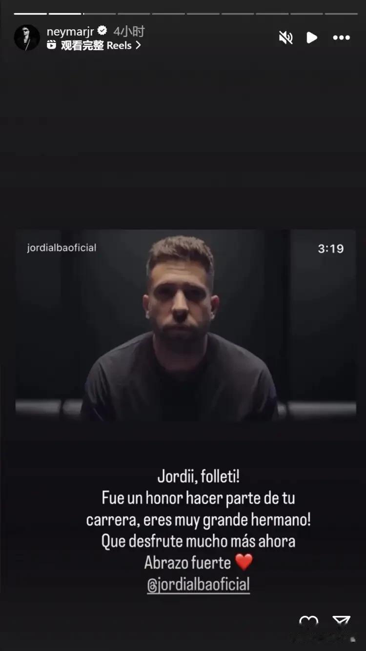 Neymar: Brother, you are great, I want to hug you tightly❤️Neymar not only left a message, but also updated social media to pay tribute to Alba! Neymar wrote: "Jordi, brother! It's an honor to be a part of your career, you are such an amazing guy! May you enjoy more good times in the future, give you a big hug."