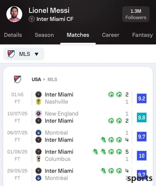 On the morning of July 13, in the 22nd round of the regular season of the Major League Baseball League, Miami International defeated Nashville 2-1 at home, winning five consecutive victories. In today's game, Messi scored a free kick directly in the 17th minute of the game, helping the team take the lead. In the 62nd minute of the game, Messi accepted the opponent's goalkeeper's gift and scored twice, helping Miami International defeat Nashville 2-1. It is worth mentioning that last week, Messi has scored at least two goals in each game with four consecutive games. Now Messi has set a record of 5 games! At the same time, Messi has scored a total of 11 goals in his last 6 games. According to official statistics from the US League, Messi has tied Joseph Martinez (11 goals from July 4 to August 4, 2018), becoming the player with the most goals in the history of the US League. This season, Messi's data in the US League reached 16 goals and 6 assists in 16 games, tied for the top scorer with Nashville's Serridge. You should know that this is the first time that Messi has completed five consecutive double hits in the league since he scored six consecutive games in La Liga in 2012, and now he is 38 years old. According to the US League schedule, Miami International will play away against Cincinnati on the morning of July 17. Will Messi tie his career record? Let's look forward to it together.