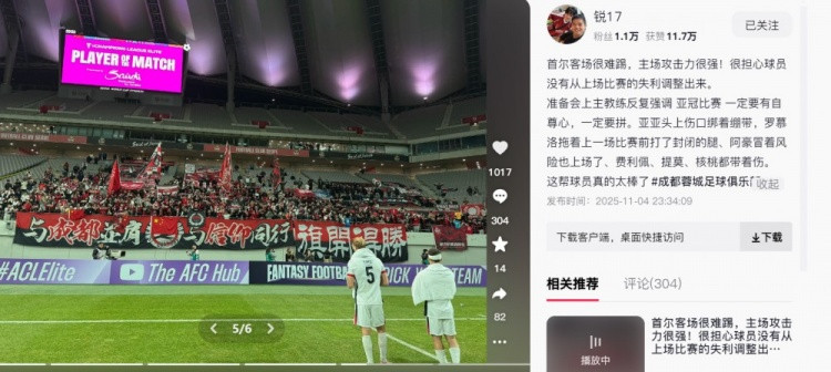 On November 5th, in the fourth round of the AFC Champions League Elite League, Chengdu Chengdu drew 0-0 away with Seoul FC. After the game, Chengdu assistant coach Gan Rui posted a message saying that the head coach repeatedly emphasized at the preparation meeting that we must fight for the AFC Champions League. These players are really great. The content of Gan Rui's social media is as follows It is difficult for Seoul to play away games, and its home attack power is very strong! I am worried that the players have not adjusted from the loss in the last game. At the preparation meeting, the head coach repeatedly emphasized that we must have self-respect and fight hard in the AFC Champions League. Yaya (Gulfinkel) had a bandage on the wound on her head, Romulo dragged his leg that was sealed before the last game, Ahao (Wei Shihao) took the risk and played, Felipe, Timo, and Walnut (Hu Tao) were all injured. These players are really great.