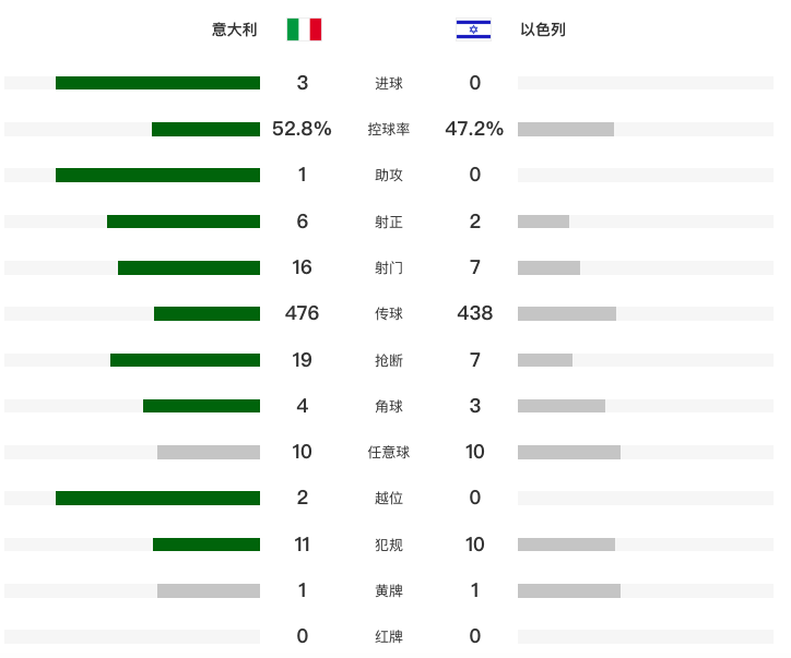 In a focus match in Group I of the World Cup European Qualifiers that ended on October 15, the Italian men’s football team defeated Israel 3-0 at home. In the first half, Retegui broke the deadlock with a penalty shot. In the second half, Cambiaso's goal was disallowed, Retegui scored twice, and Mancini sealed the victory with a stoppage-time header. After Italy lost to Norway 0-3 at the start of the world preliminaries, it has won 5 consecutive victories. With 15 points in 6 rounds, Italy is still 3 points behind Norway at the top. [Key Focus] In the 2nd minute of stoppage time in the first half, Retegui made a point, and then personally took the penalty volley and hit the upper corner. Italy led Israel 1-0. In the 74th minute, Retegui stole the ball in the frontcourt, entered the penalty area and shot a shot that sent shockwaves around the world. Italy 2-0 Israel. In the last 4 World Cup preliminaries, Retji, who plays in the Saudi League, contributed 5 goals, 4 assists and 9 goals. In stoppage time, Dimarco assisted Mancini with a header to seal the victory, Italy 3-0 Israel. [Highlight Replay] In the 6th minute, Retegui hit the goal with a low shot in the penalty area, and the ball missed the goal. In the 10th minute, Cambiaso dribbled the ball horizontally and shot a powerful shot that missed the baseline. In the 28th minute, Israel launched a fatal counterattack, and Solomon's shot was saved by Donnarumma. Change sides and fight again. In the 54th minute, Tonali's cross was blocked and Barrera shot a volley over the crossbar. In the 66th minute, Andrea Cambiaso was offside and the goal was disallowed. In the 84th minute, Pio Esposito shot in the penalty area, but the ball was saved by the goalkeeper. [Player Rating] [Statistics] [Playing Lineup] Italy's starting lineup: 1-Donnarumma, 22-Di Lorenzo, 23-Mancini, 13-Calafioli, 20-Cambiaso (85 '4-Spinazzola), 18-Barella, 5-Locatelli ( 86 '16-Cristante), 8-Tonali (93 '11-Picoli), 3-Dimarco, 10-Raspadori (46 '15-Esposito), 9-Retegui (92 ' 19-Cambiagi) Substitute did not appear: 12-Meret, 14-Vicario, 2-Gabibia, 6-Udoji, 21-Kubola, 7-Orsolini, 17-Fratesi