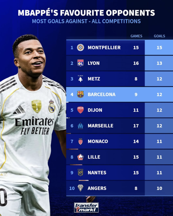 On October 27, Hupu Xundezhuan compiled a list of Mbappe’s favorite opponents. Mbappe scored 15 goals in 15 games against Montpellier and is called his favorite opponent; he ranked second with 13 goals against Angry; he scored 12 goals against Barcelona and ranked fourth. The following is the complete list: 1. Montpellier: 15 goals in 15 games 2. Lyon: 13 goals in 16 games 3. Metz: 12 goals in 8 games 4. Barcelona: 12 goals in 9 games 5. Dijon: 1 12 goals in 1 game 6. Marseille: 12 goals in 17 games 7. Monaco: 11 goals in 14 games 8. Lille: 11 goals in 15 games 9. Nantes: 11 goals in 15 games 10. Angers: 10 goals in 8 games