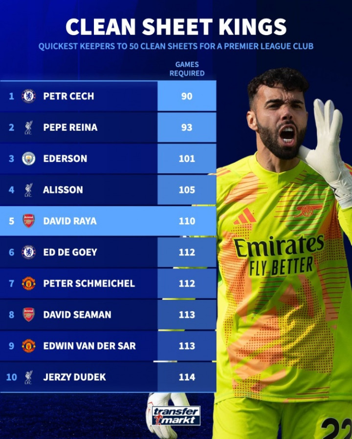 On November 6th, Arsenal defeated Slavia Prague 3-0 in the Champions League away game. Raya completed the 50th clean sheet in Arsenal's career. It took a total of 110 games, ranking the fifth fastest among Premier League club goalkeepers to achieve 50 clean sheets. The number of games used by Premier League club goalkeepers to keep 50 games: 1-Cech 90 games for Chelsea 2-Reina 93 games for Liverpool 3-Ederson 101 games for Manchester City 4-Alisson 105 games for Liverpool 5-La Asia 110 games for Arsenal 6-Dehuye 112 games for Chelsea 7-Old Schmeichel 112 games for Manchester United 8-Seaman 113 games for Arsenal 9-Van der Sar 113 games for Manchester United 10-Dudek 114 games for Tottenham