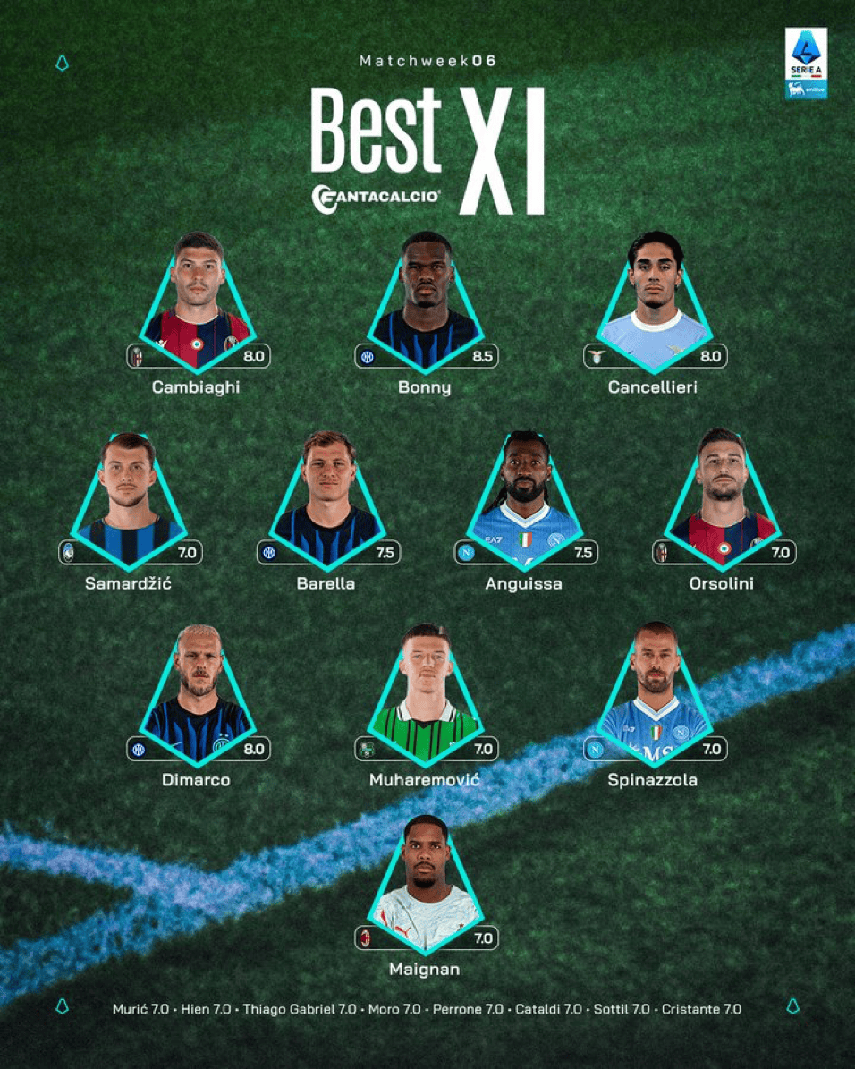 Hupu News on October 7th Serie A officially announced the best lineup for this round of the league, and three players from Inter Milan were selected. [Lineup details] Goalkeeper: Maignan (AC Milan) Defender: Dimarco (Inter Milan), Muharemovic (Sassuolo), Spinazzola (Naples) Midfielder: Sama Erzic (Atalanta), Varela (Inter Milan), Anguisa (Naples), Orsolini (Bologna) Forward: Cambiagi (Bologna), Bonny (Inter Milan), Canselieri (Lazio)
